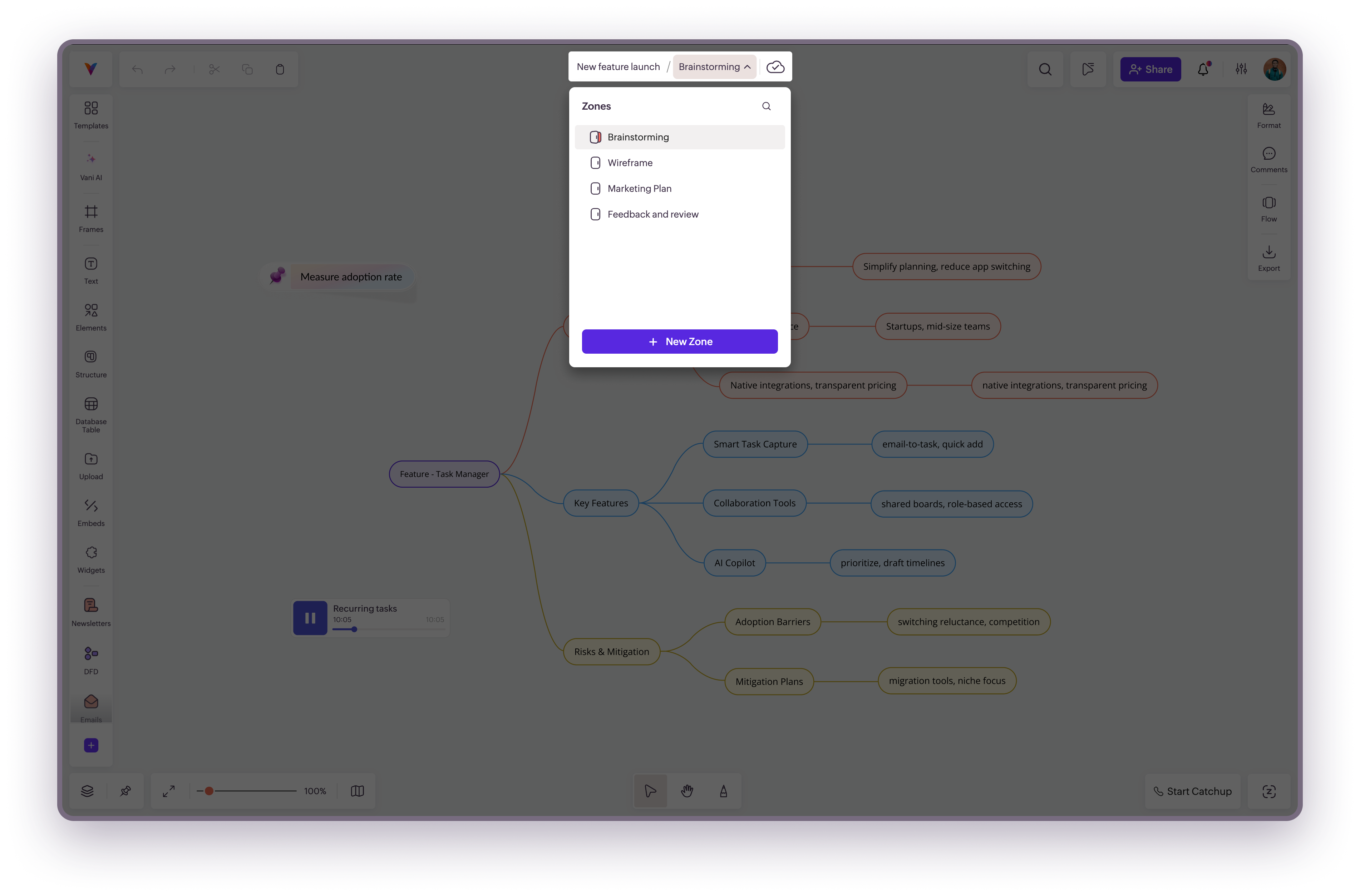 Vani follows a tiered canvas structure to make organizing work easier. Within each Space, you can create multiple Zones, each acting as its own infinite canvas.