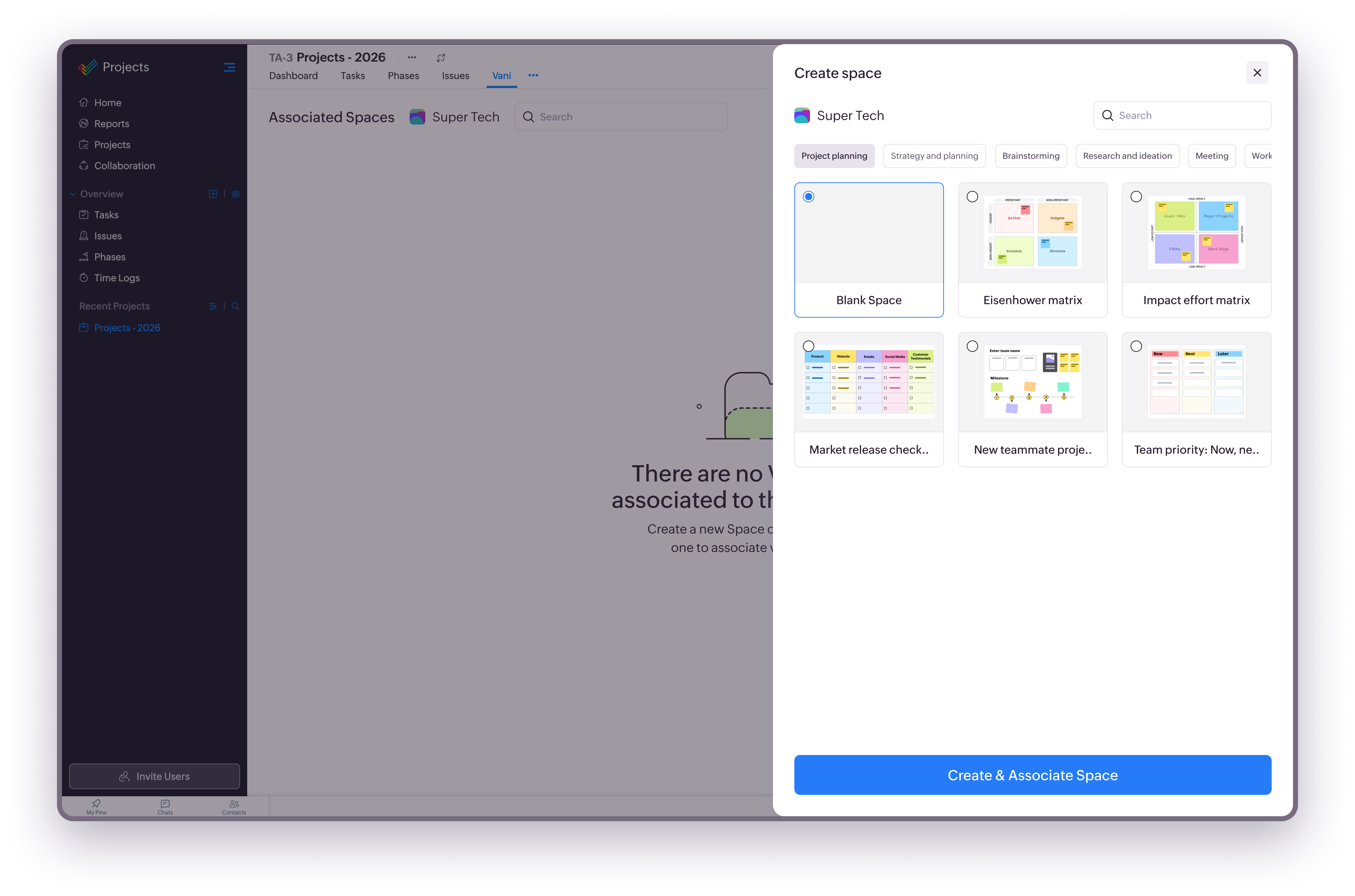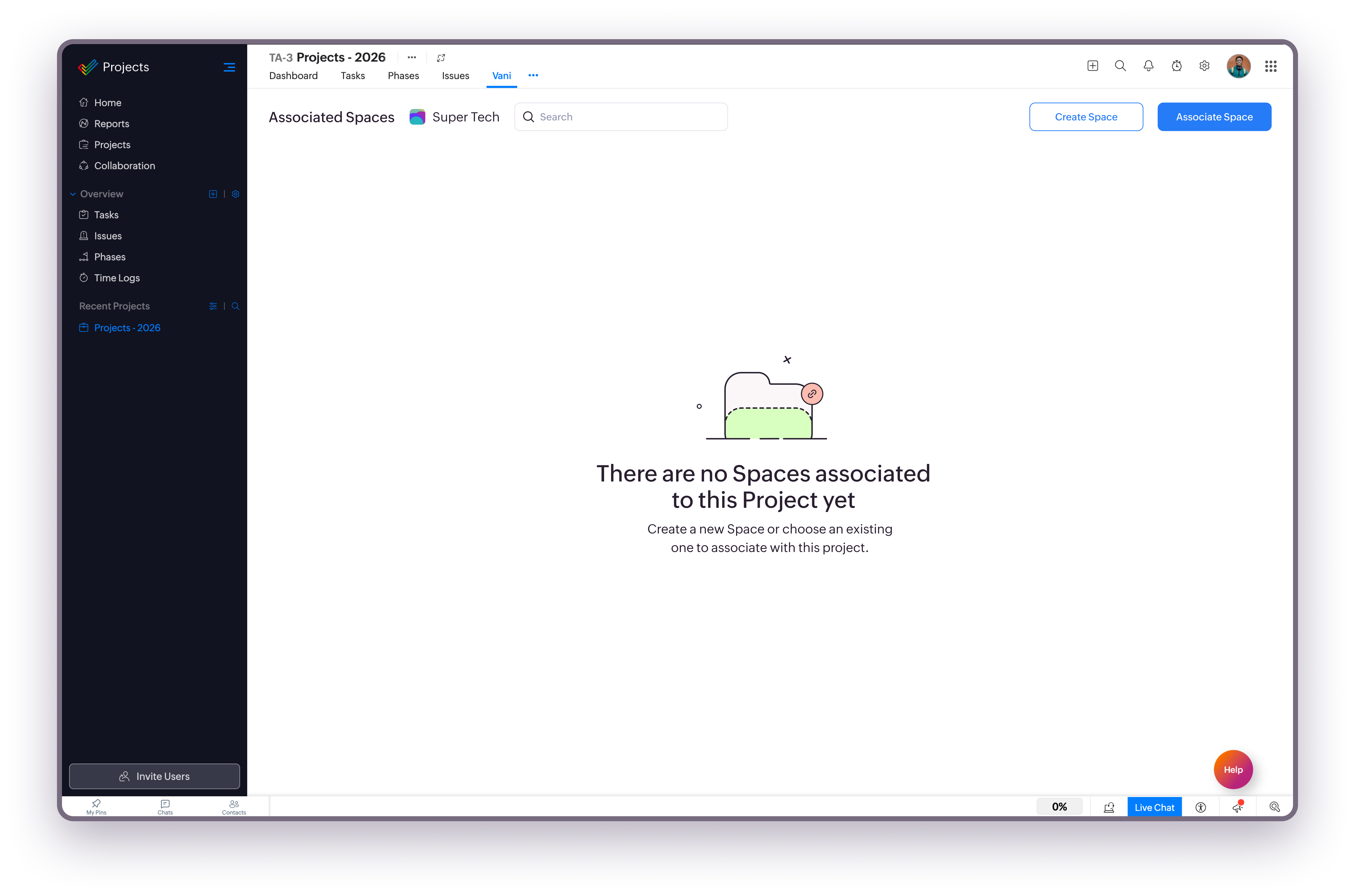 Open a project in Zoho Projects and select the Vani tab. This tab lists all Spaces associated with the project. If no Spaces are associated yet, you’ll see an empty state with options to create or associate a Space.