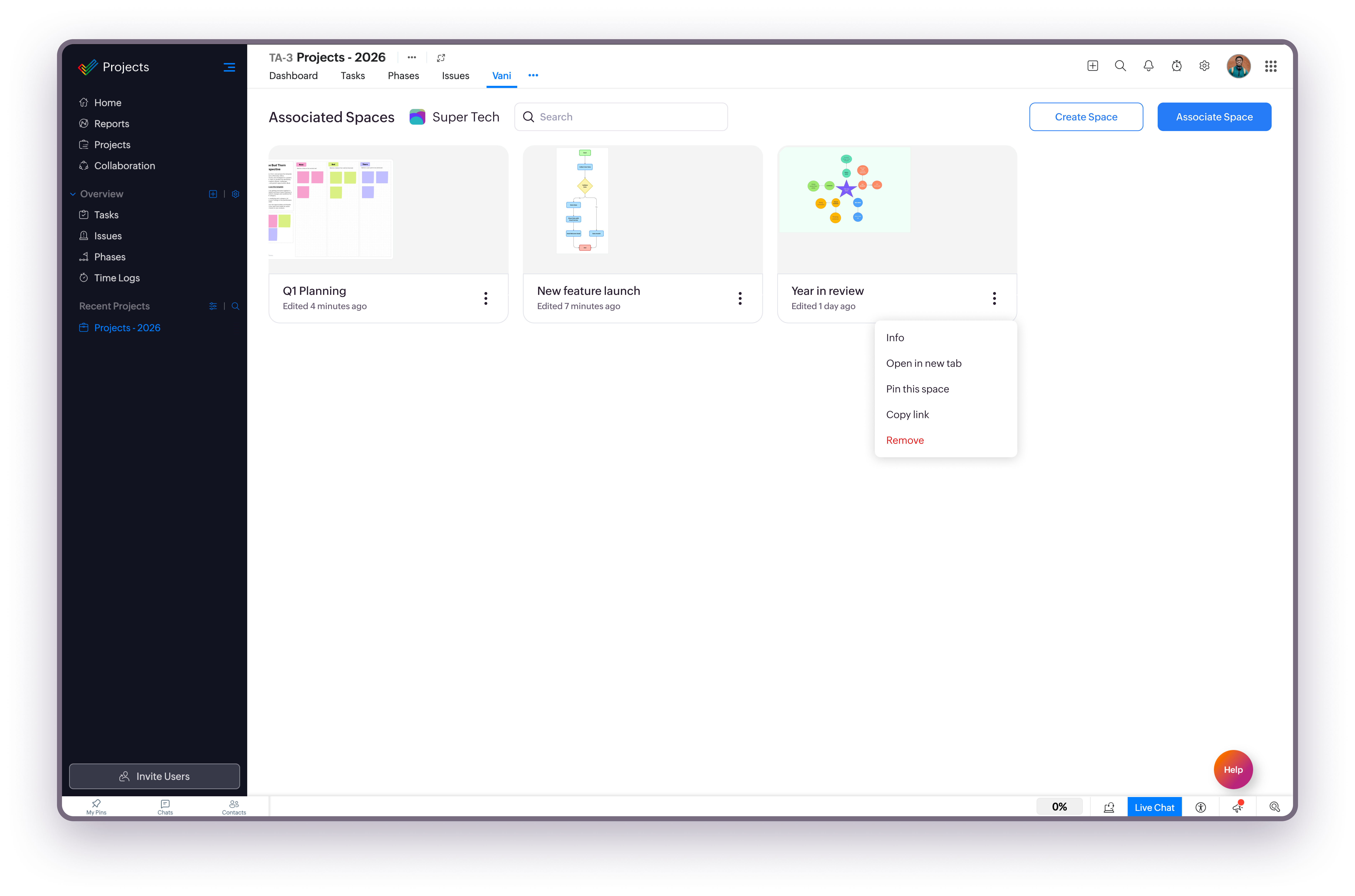 Once Vani is set up, you can access and work with Vani Spaces directly from your projects in Zoho Projects.