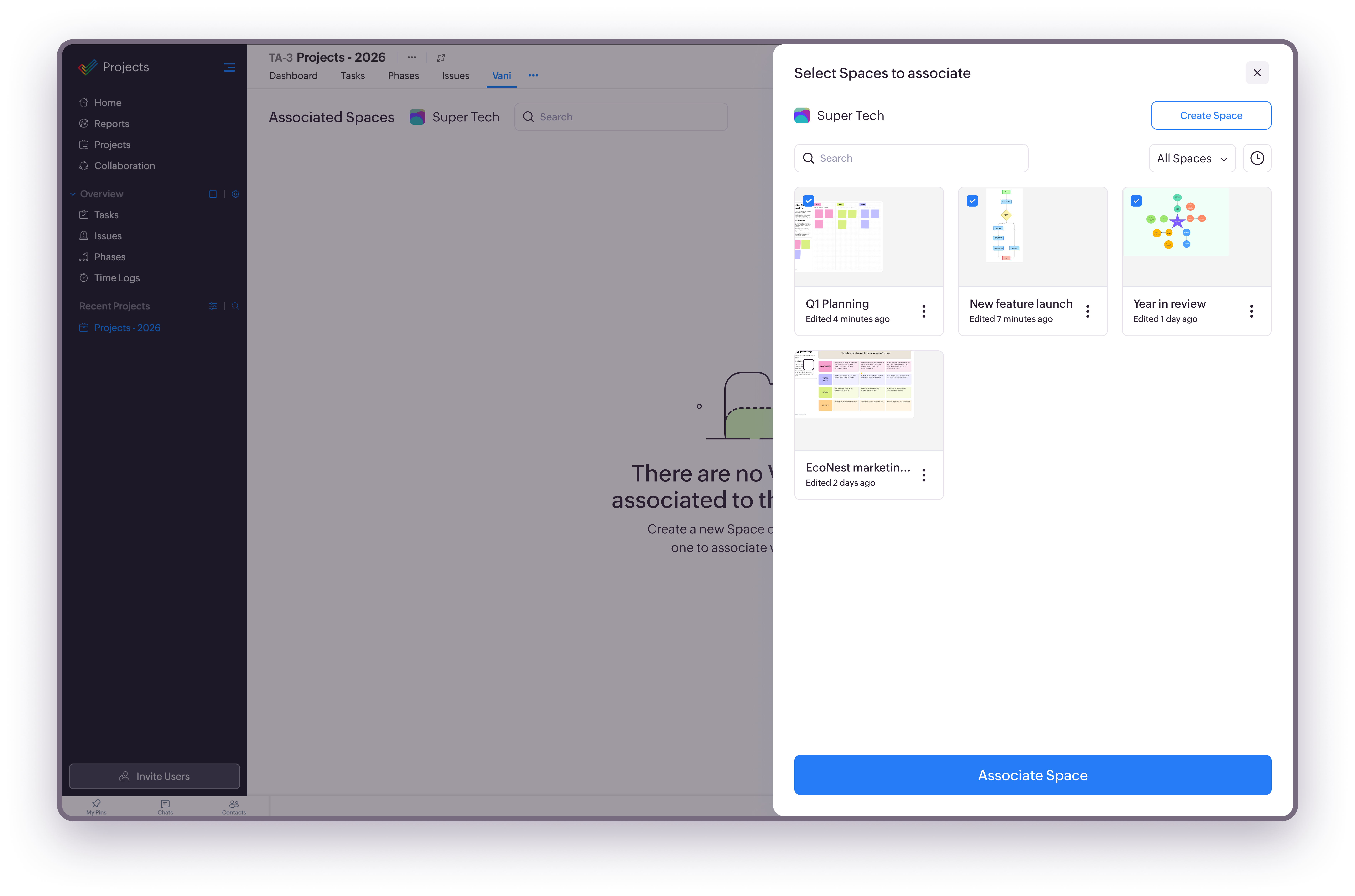 Select any associated Space to open it directly inside Zoho Projects. You can view, edit, and collaborate in the Space without leaving the project. Changes made in the Space are updated in real time.