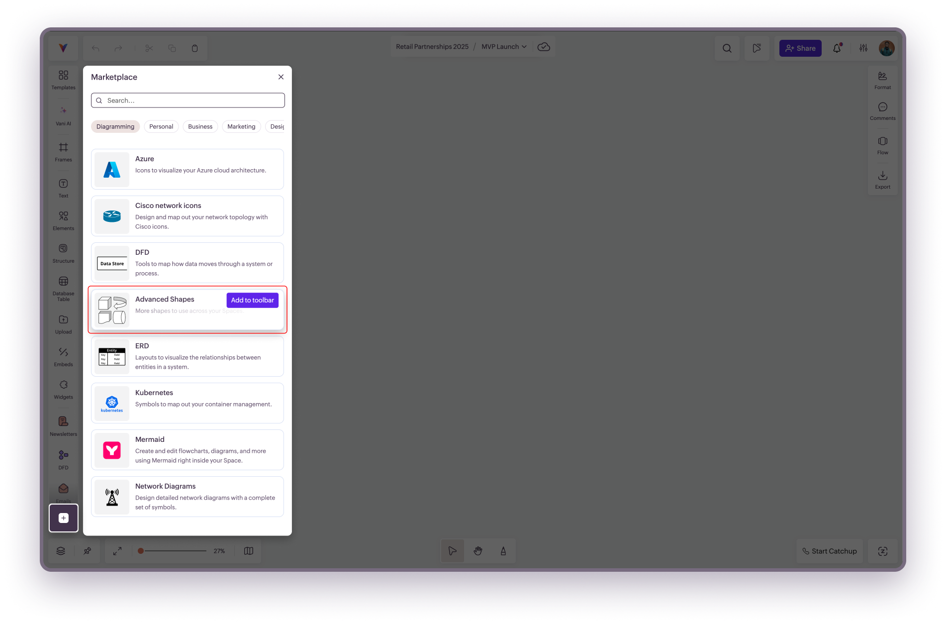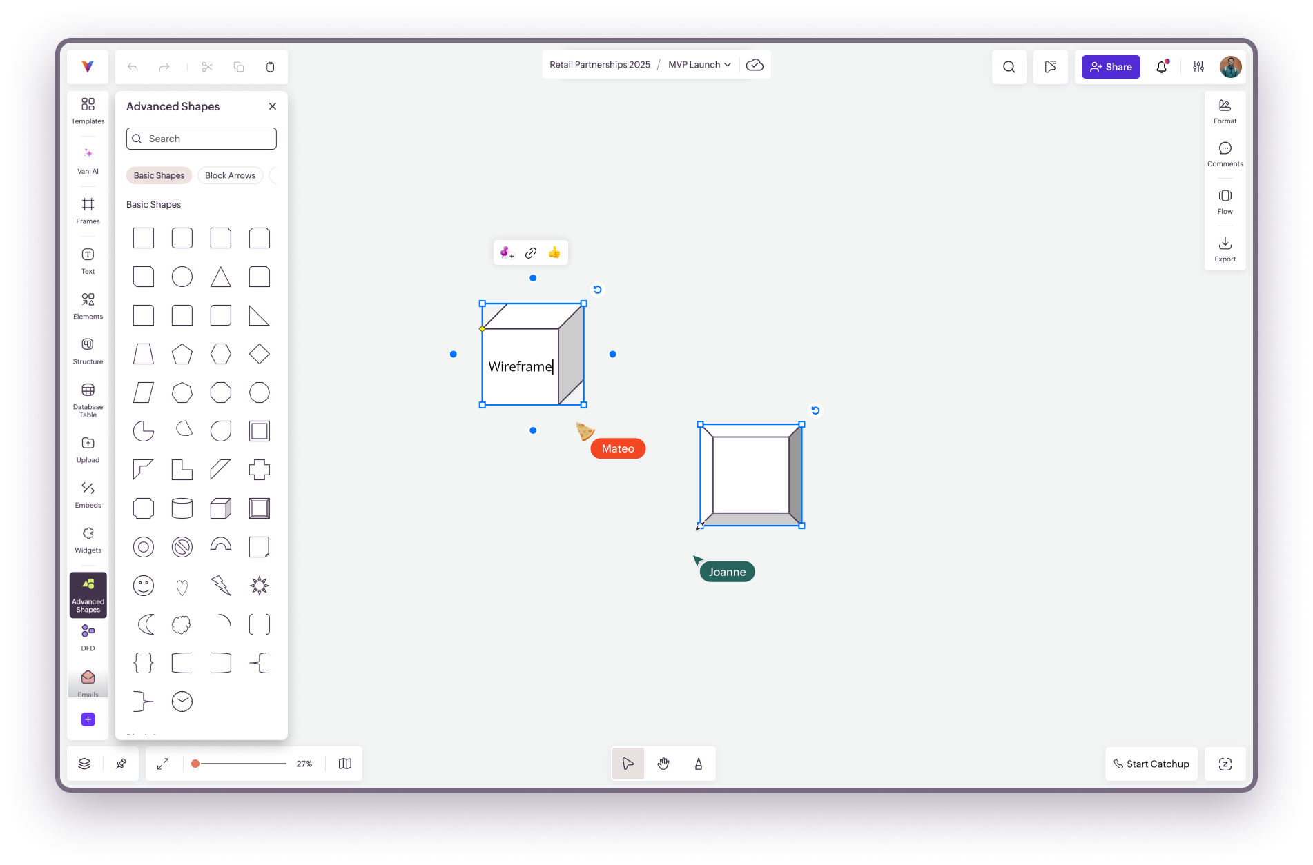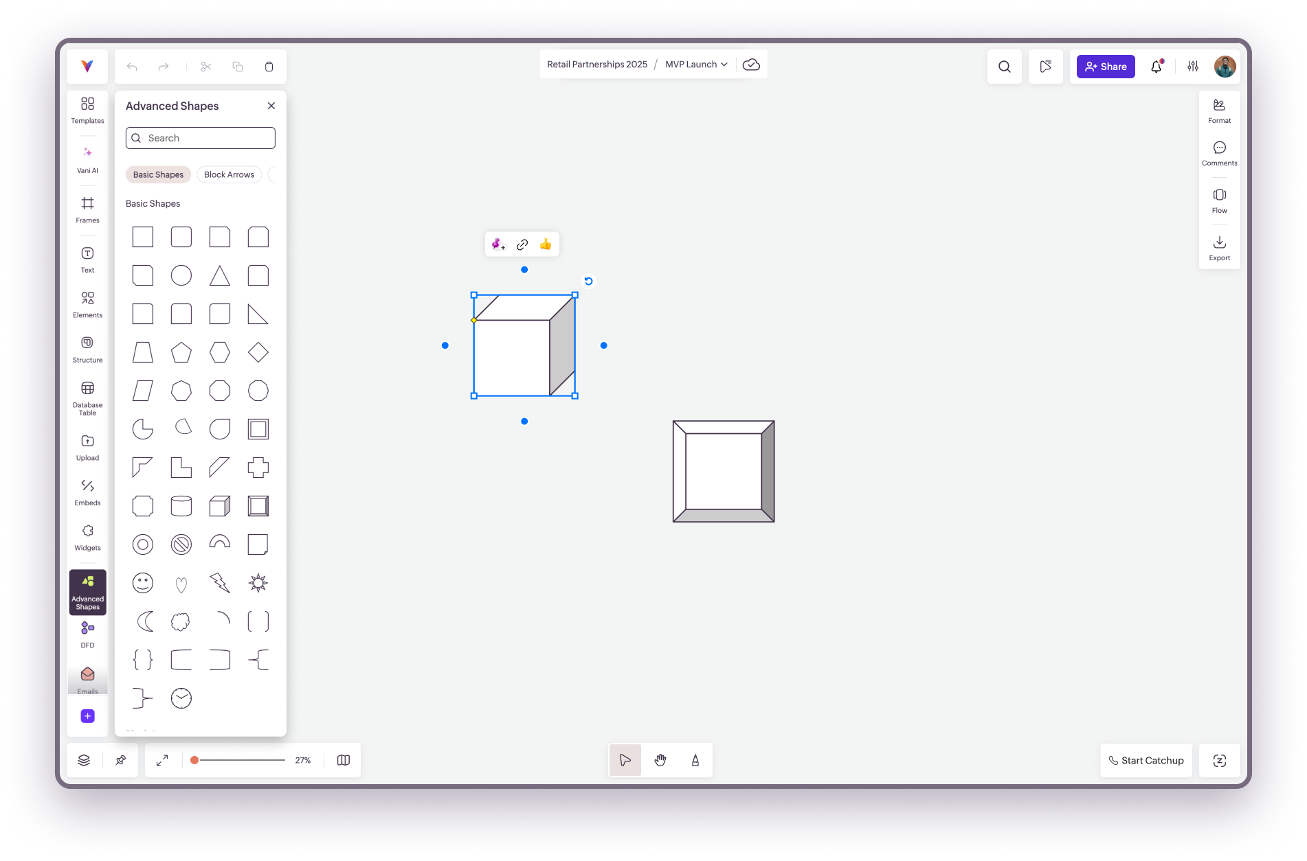 Shapes in Vani help you visually organize content and structure ideas within a Space. You can use them to build diagrams, workflows, and frameworks. Add text directly inside any shape, making them useful not just for visuals but also for labeling ...