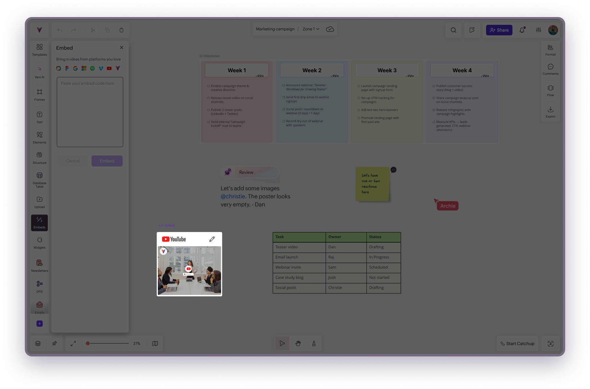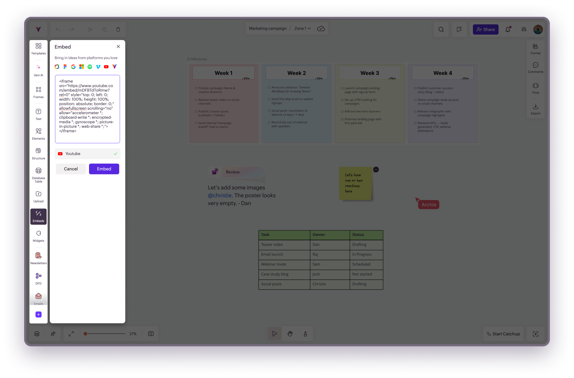 You can enrich your Space by embedding content from external apps. Embeds allow you to bring in references, inspirations, and live documents without leaving Vani. This makes it easier for your team to view and interact with relevant resources while collaborating.