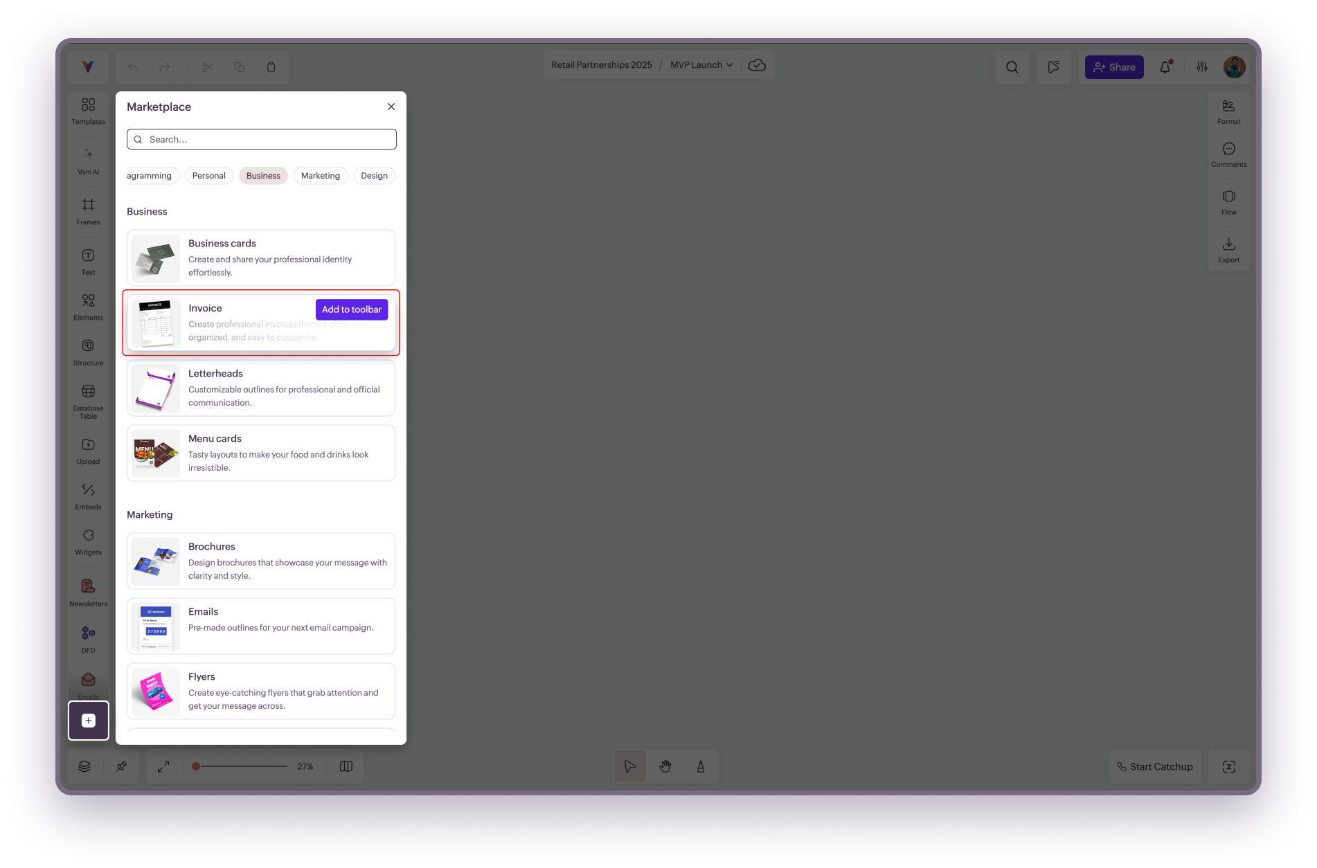 Flyers Kit provides quick and clean flyer templates suitable for events, promotions, and informational handouts. These layouts help you create concise, single page materials inside Vani. How to add Flyers Kit to the toolbar Open Marketplace. Select ...