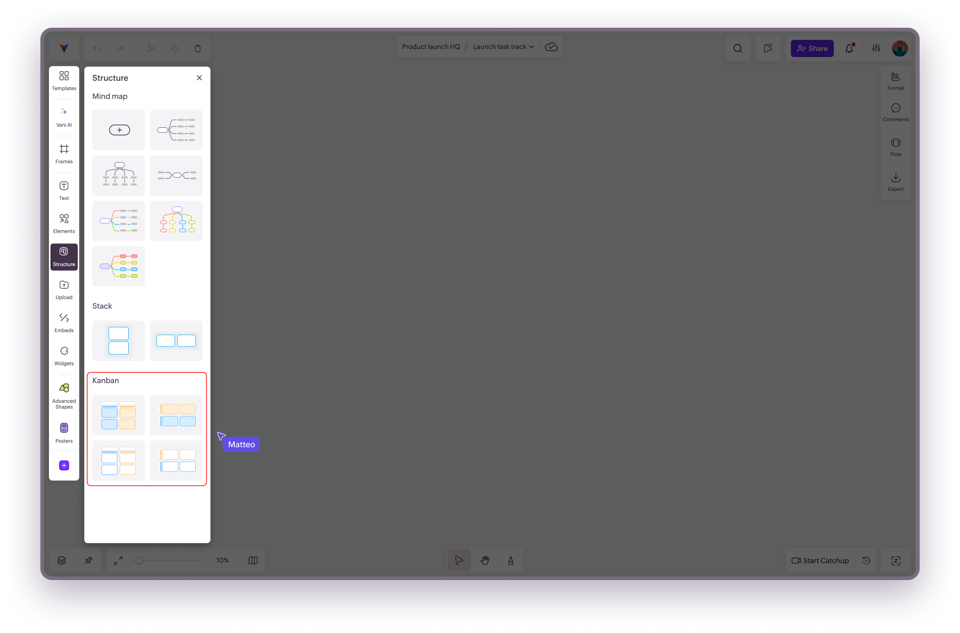 Kanban boards help you track tasks and manage workflows visually. In Vani, Kanban boards are interactive, you can drag and drop cards across lanes to track progress, prioritize work, or organize ideas.
