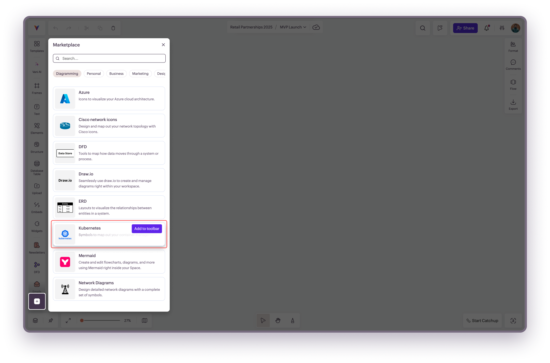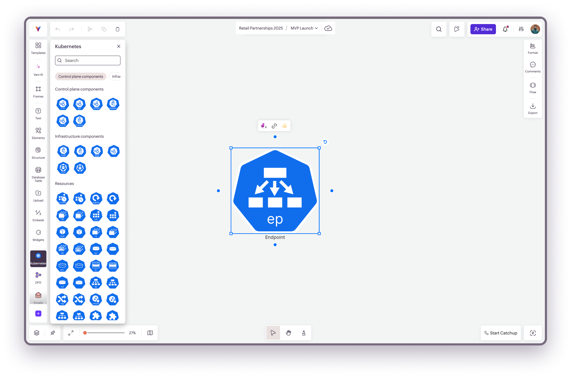 Kubernetes Kit provides prebuilt shapes that represent Kubernetes components such as clusters, pods, services, and workloads. These icons help you construct diagrams that show how containerized applications are deployed and managed.