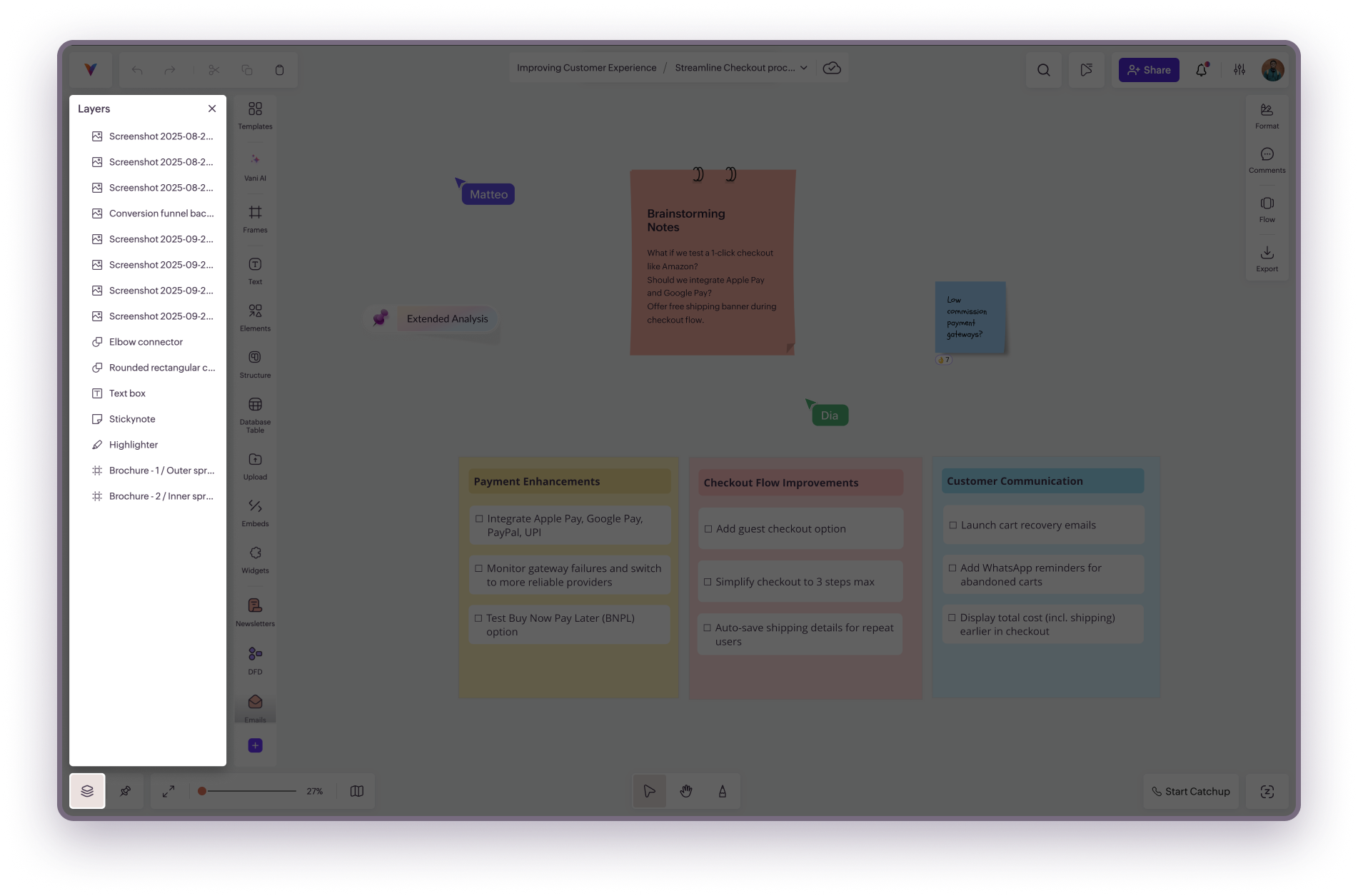 The Layers panel shows all elements in the current Zone, including frames, text boxes, templates, shapes, images, and other objects. Use it to quickly find and select items without searching on the canvas.