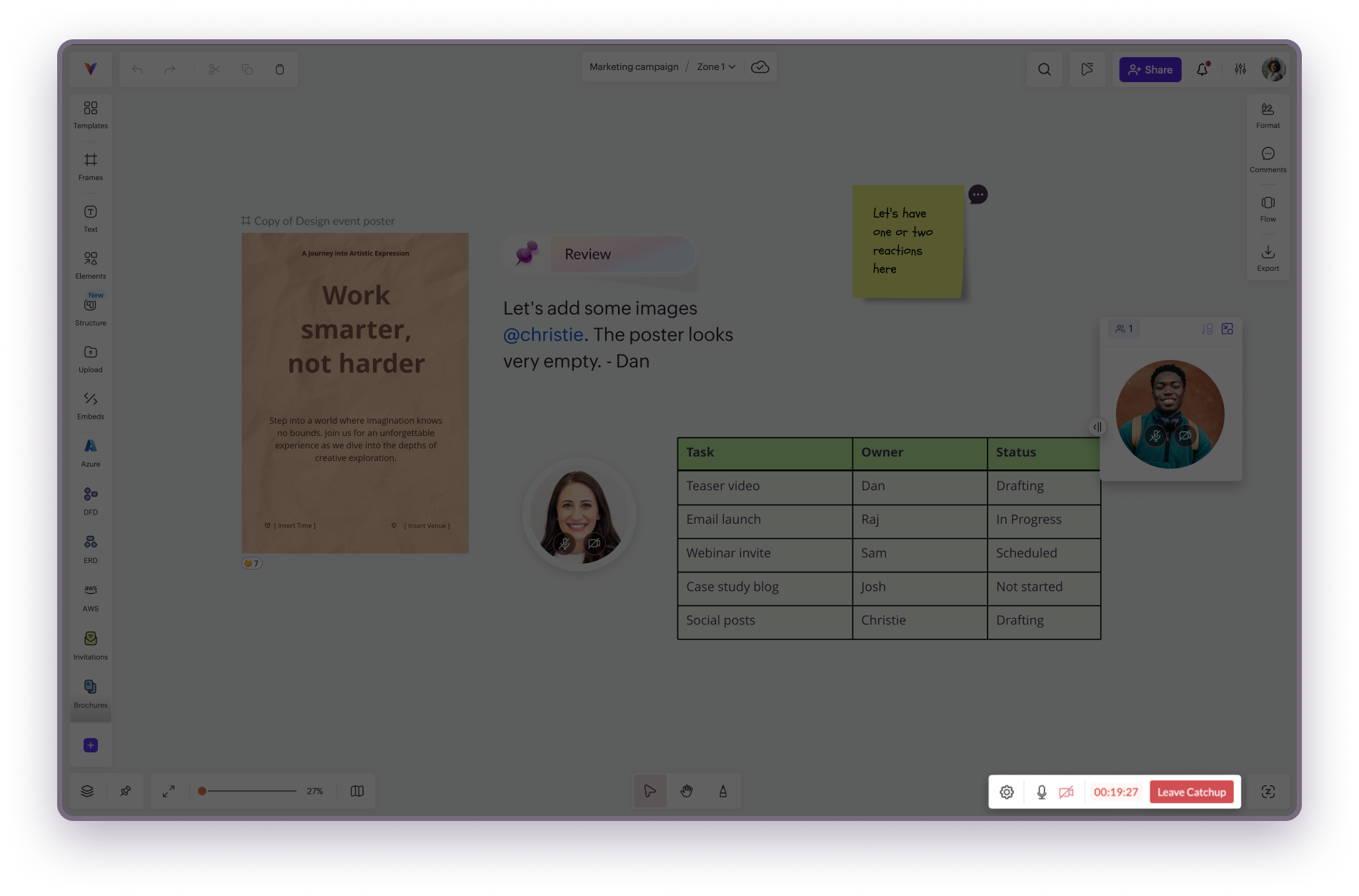 Catchup video tiles in Vani are designed to help you collaborate without getting in the way of your canvas. You can move them, resize them, and place them anywhere, so you can talk and work at the same time. Turn video or audio on/off You can mute ...