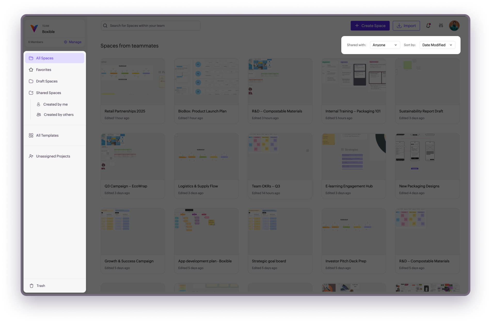 Use the search bar at the top to quickly find a Space, Zone, Frame, or even text inside your Spaces.