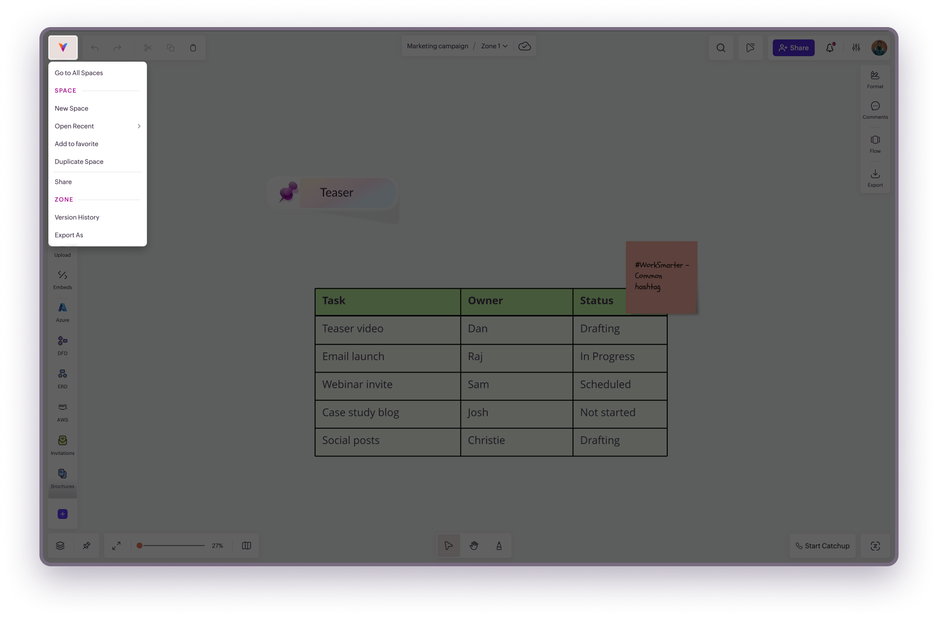 A Space is where all the action happens in Vani. It’s your team’s shared hub for brainstorming, planning, creating, and reviewing work together. Each Space opens as an infinite canvas where you can drop your ideas, build workflows, collaborate in ...