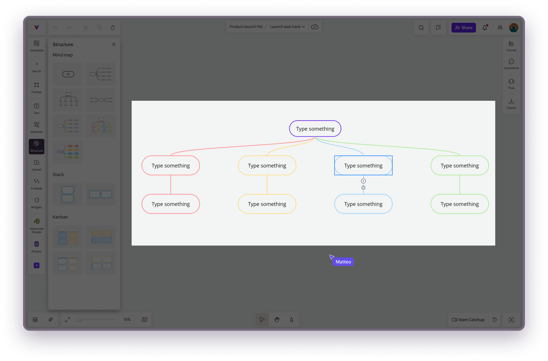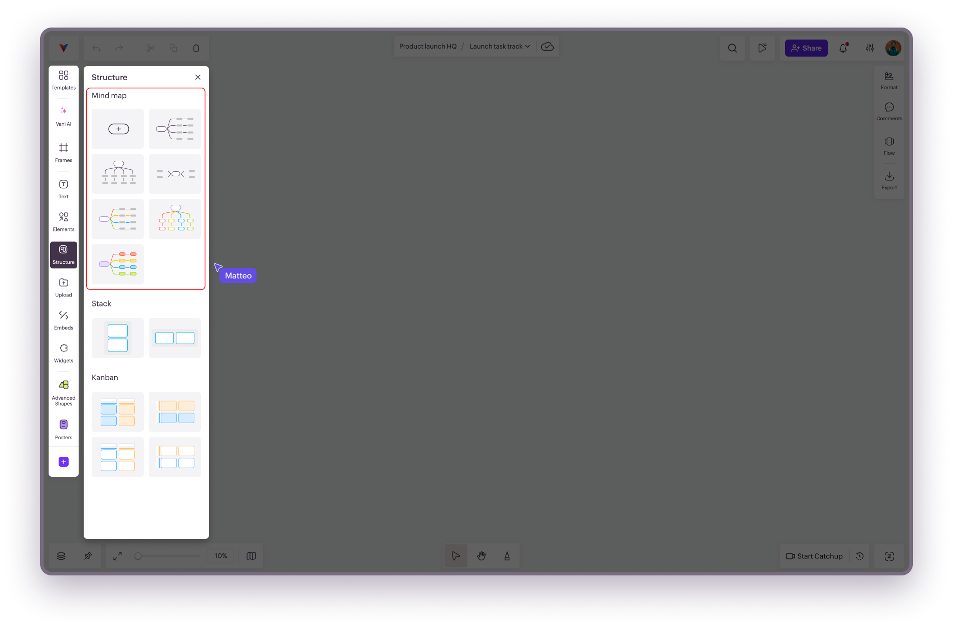 You can add a mind map from the Structure panel on your left toolbar. Choose from multiple layout styles to suit your use case.