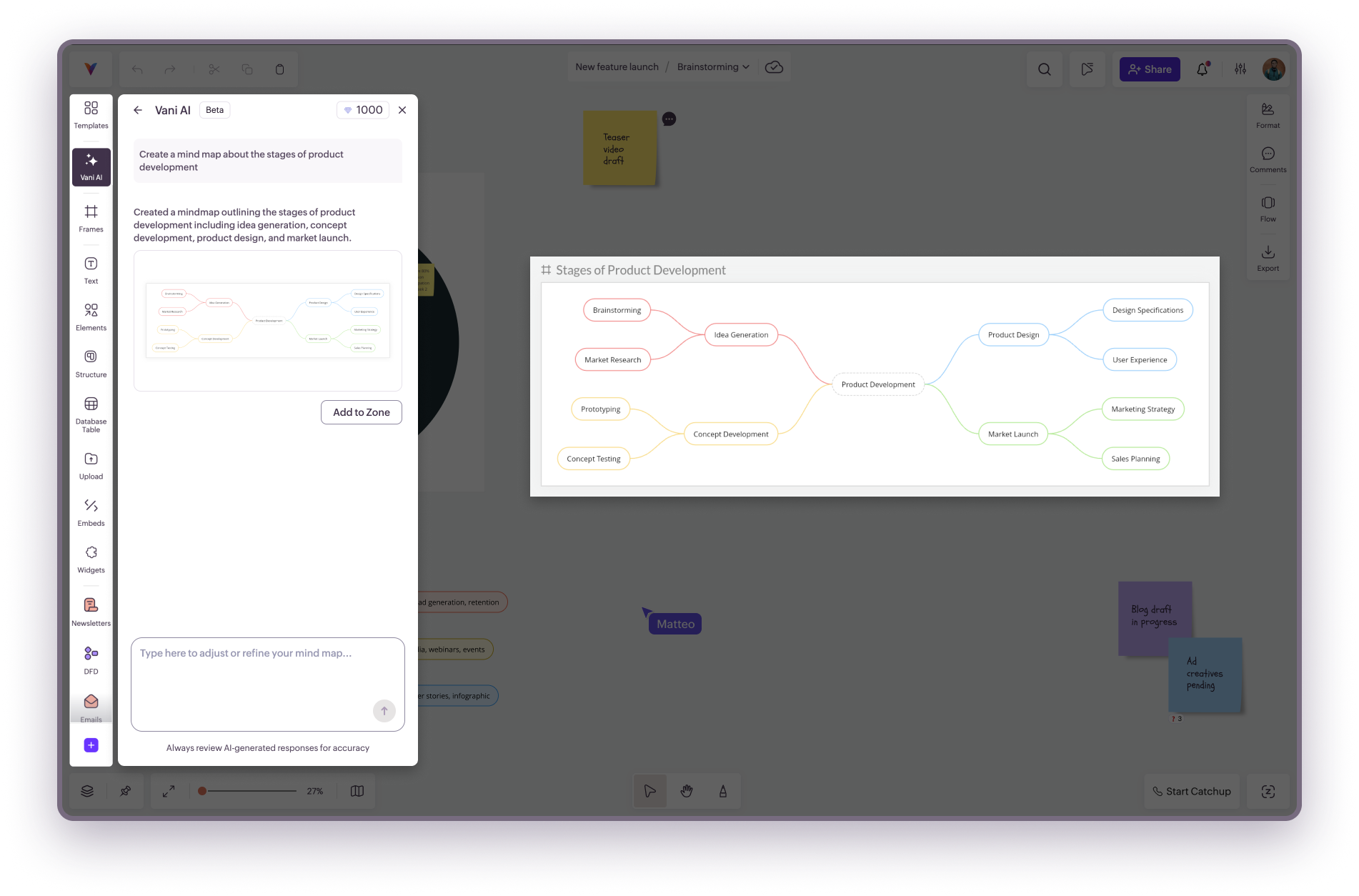 Vani AI helps you create, visualize, and summarize faster inside your Space. With AI built right into Vani, you can move from idea to visualization in seconds without switching tools. What you can do Create a mind map from a prompt Create a flowchart ...
