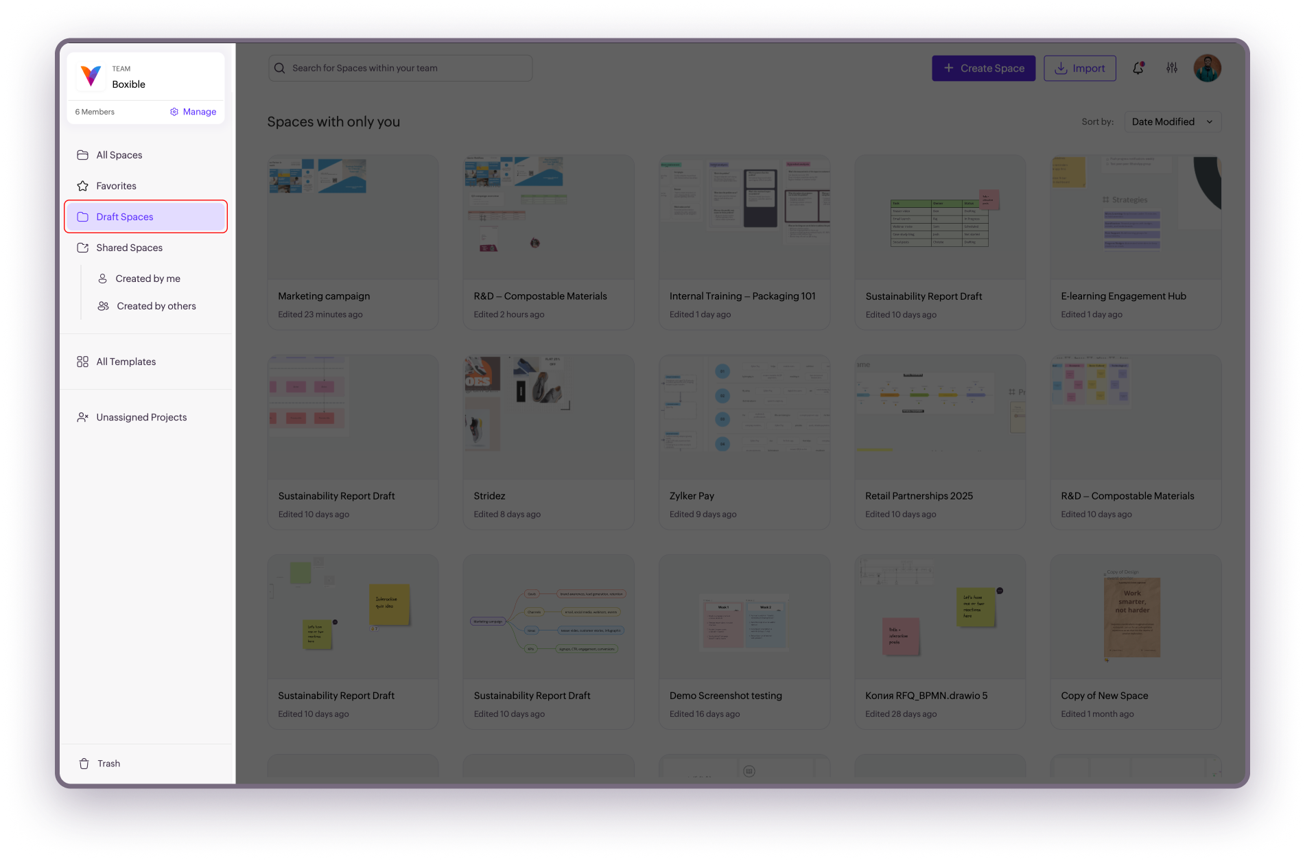 Draft Spaces are Spaces where you are the only Spacemate. A Draft Space is created when no other Spacemates are added, or when all other Spacemates are removed. You can use these Spaces for working alone, as they will not be visible to any other teammates, unless you share them.