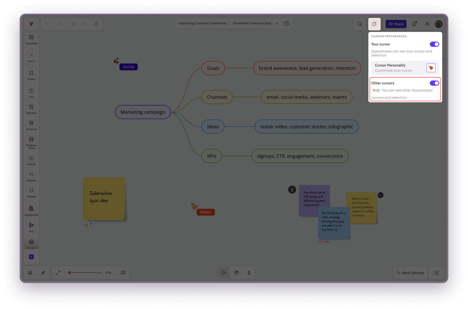 Vani also lets you know when someone follows your cursor, so you are always aware of whether a teammate is following you. You can see the number of Spacemates following you with the Cursor Preferences button. Click the button to see the names and images of the following Spacemates.