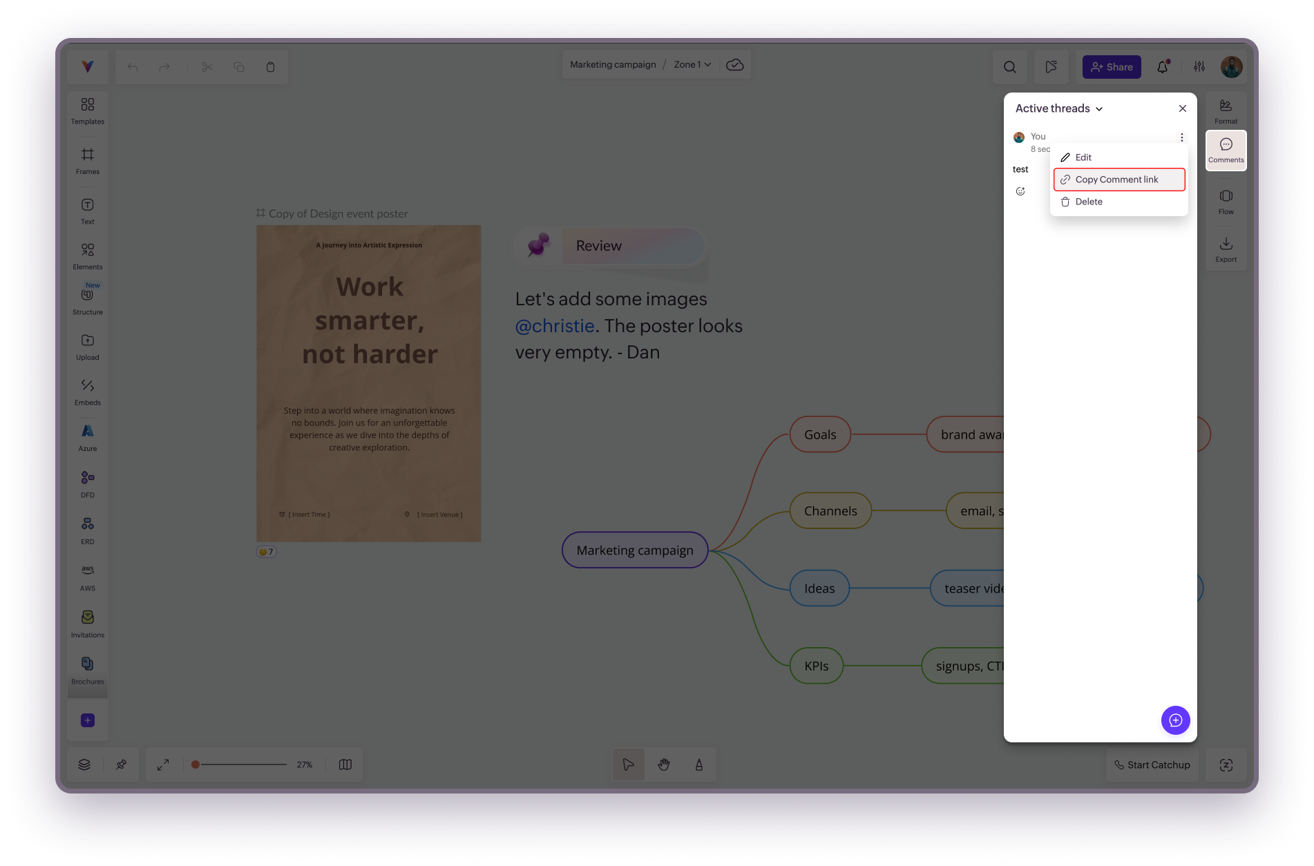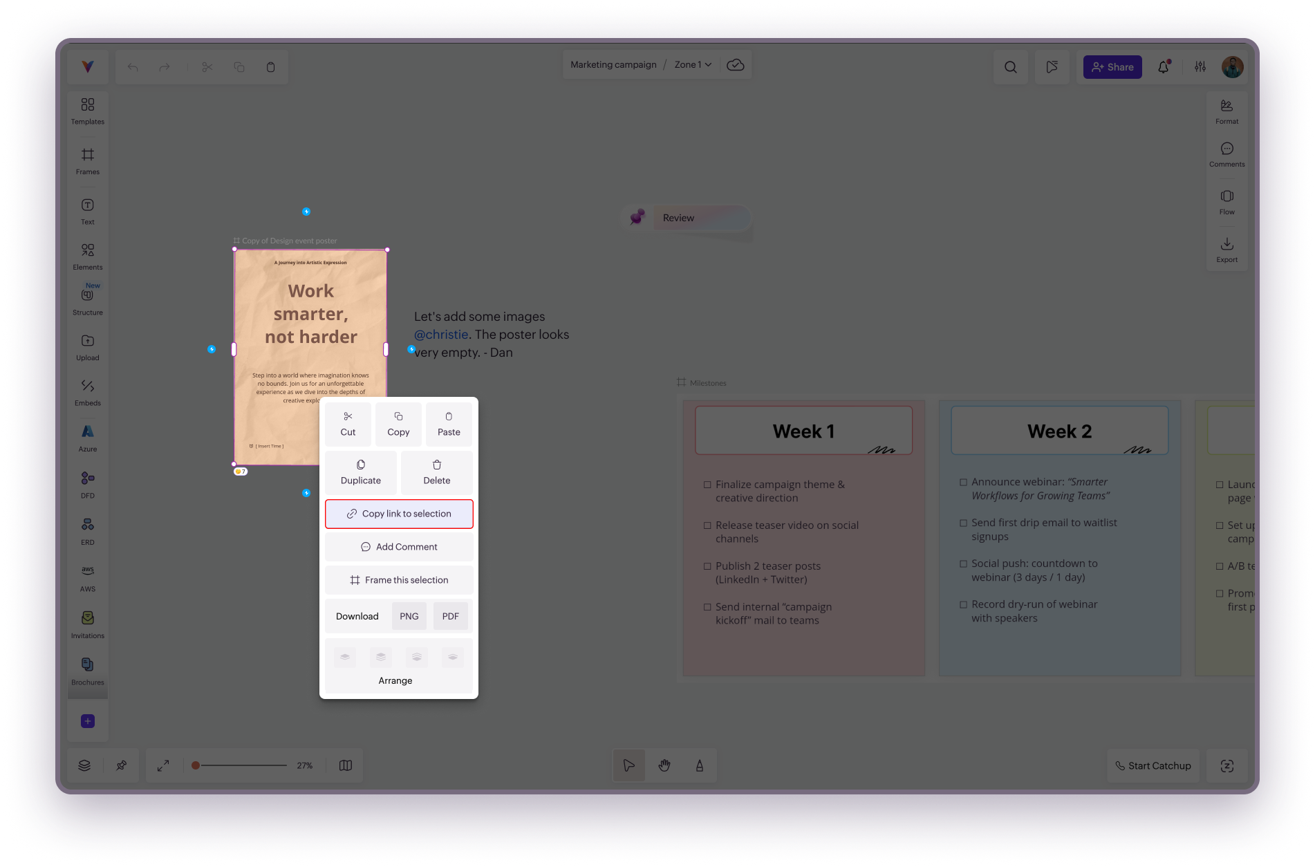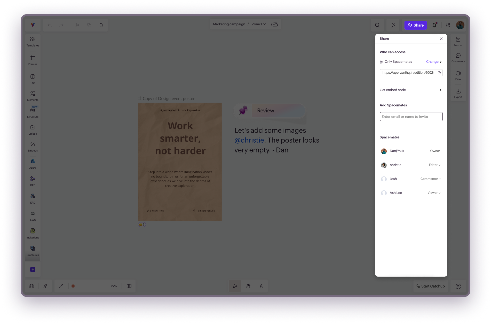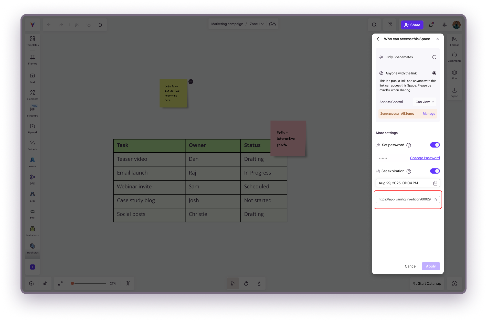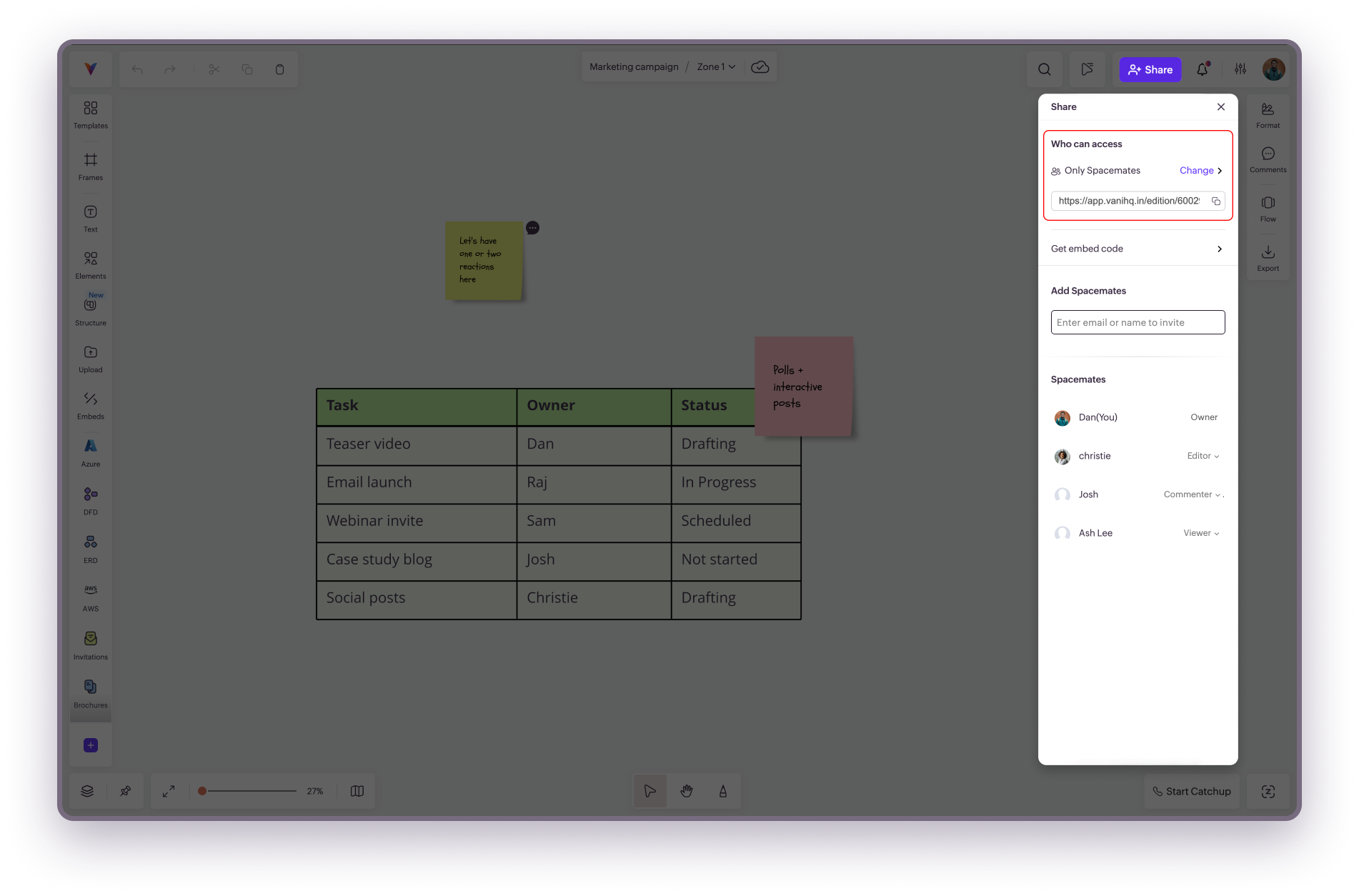 Once you're ready to share your work, Vani gives you multiple ways to do it. You can invite teammates to collaborate, or share your Space with people outside your team when needed.