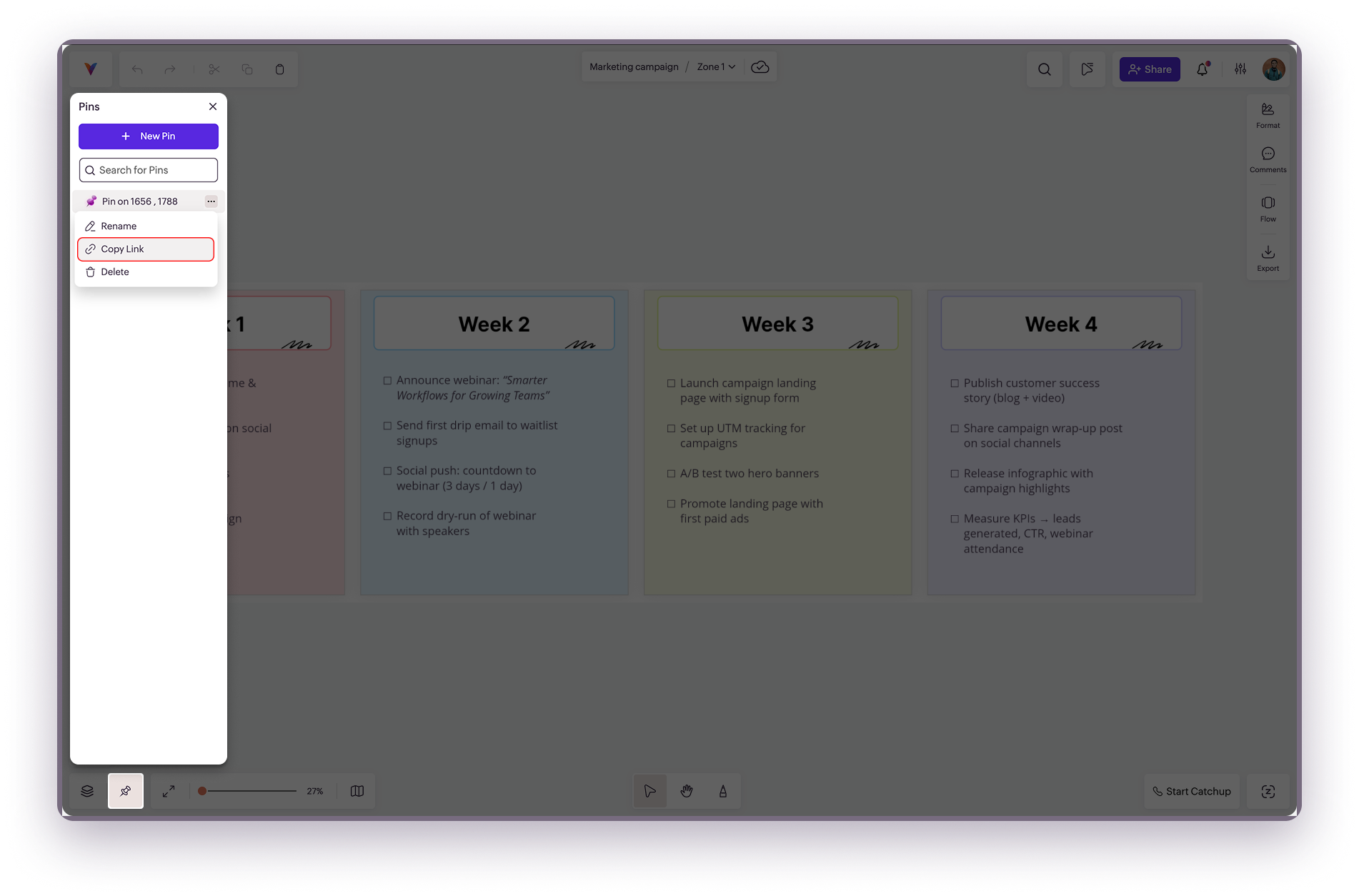 Using the Pin tool: In the Pin pane, click Copy link next to a Pin.