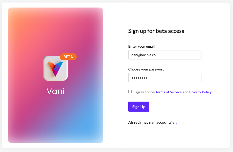 - Go to vanihq.com and click Sign up, or head directly to app.vanihq.com/signup