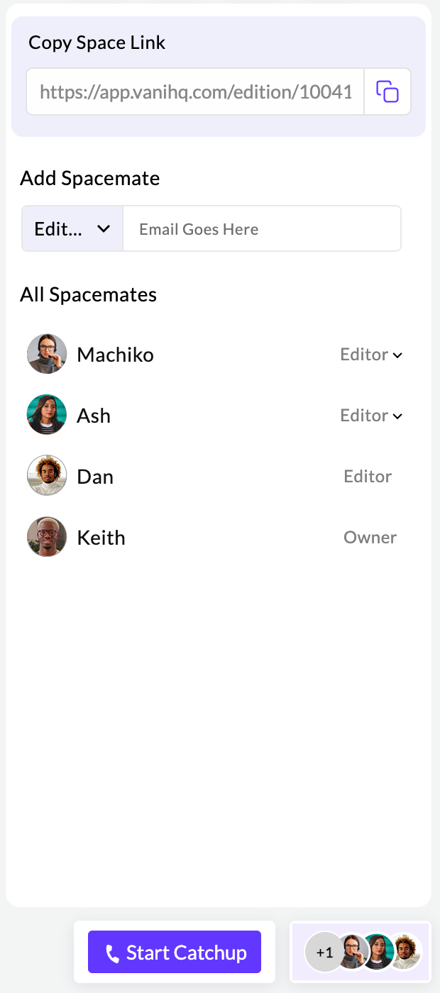 Once you're ready to share your work, Vani gives you multiple ways to do it. You can invite teammates to collaborate, or share your Space with people outside your team when needed. Sharing with teammates (Spacemates) When you share a Space with ...