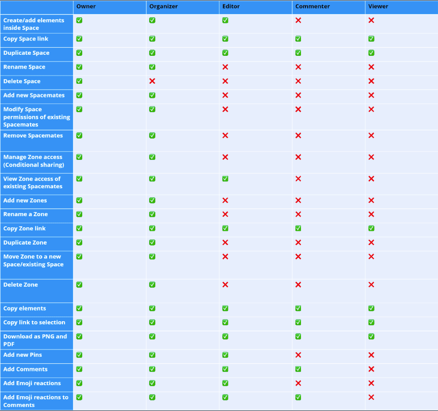 When you invite teammates to work together in a Space, they will be added as Spacemates. Here’s a quick look at what each role can do: