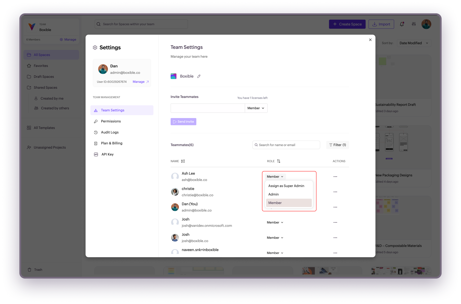 Super Admins and Admins can change the roles of other admins or members later through Team Settings.