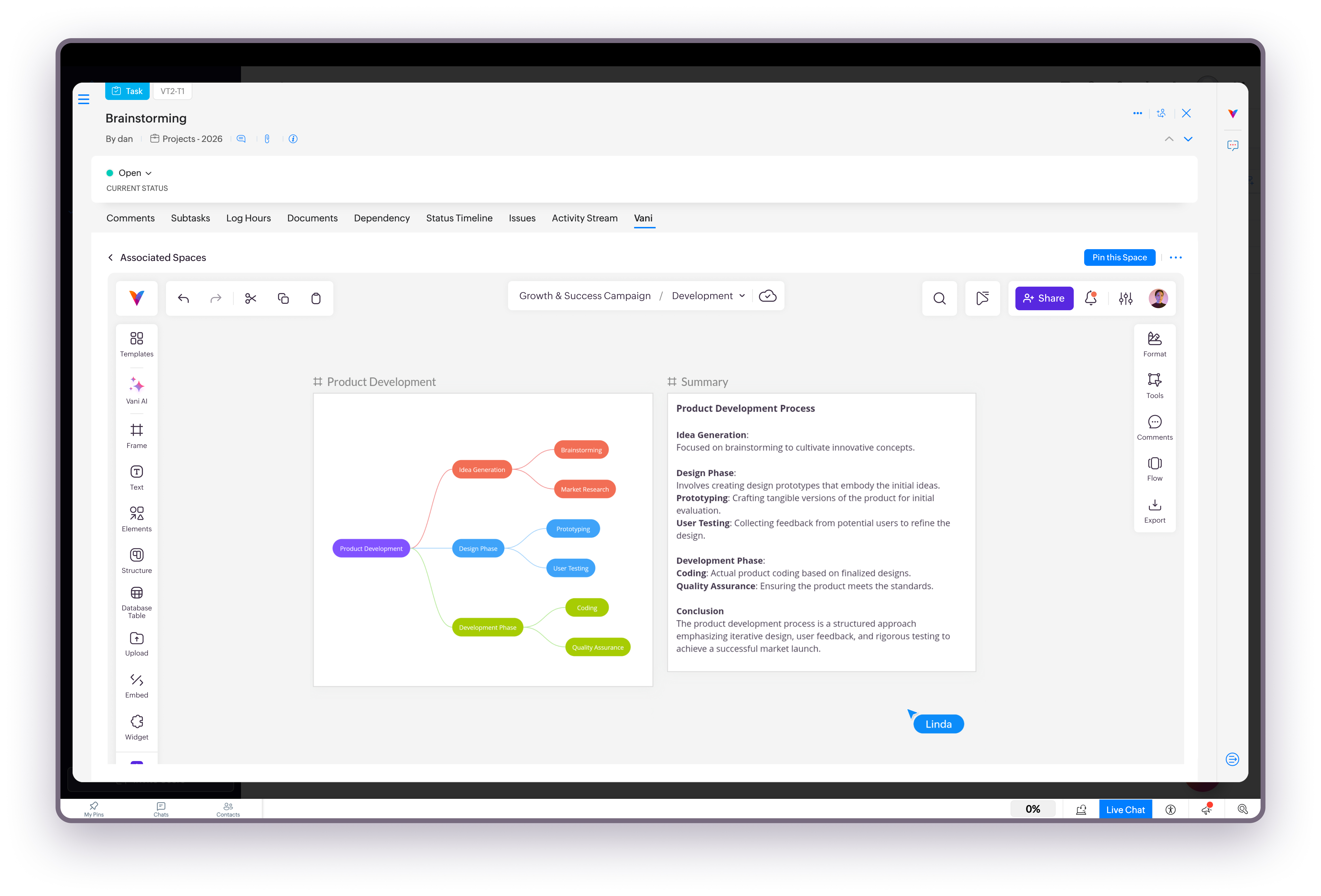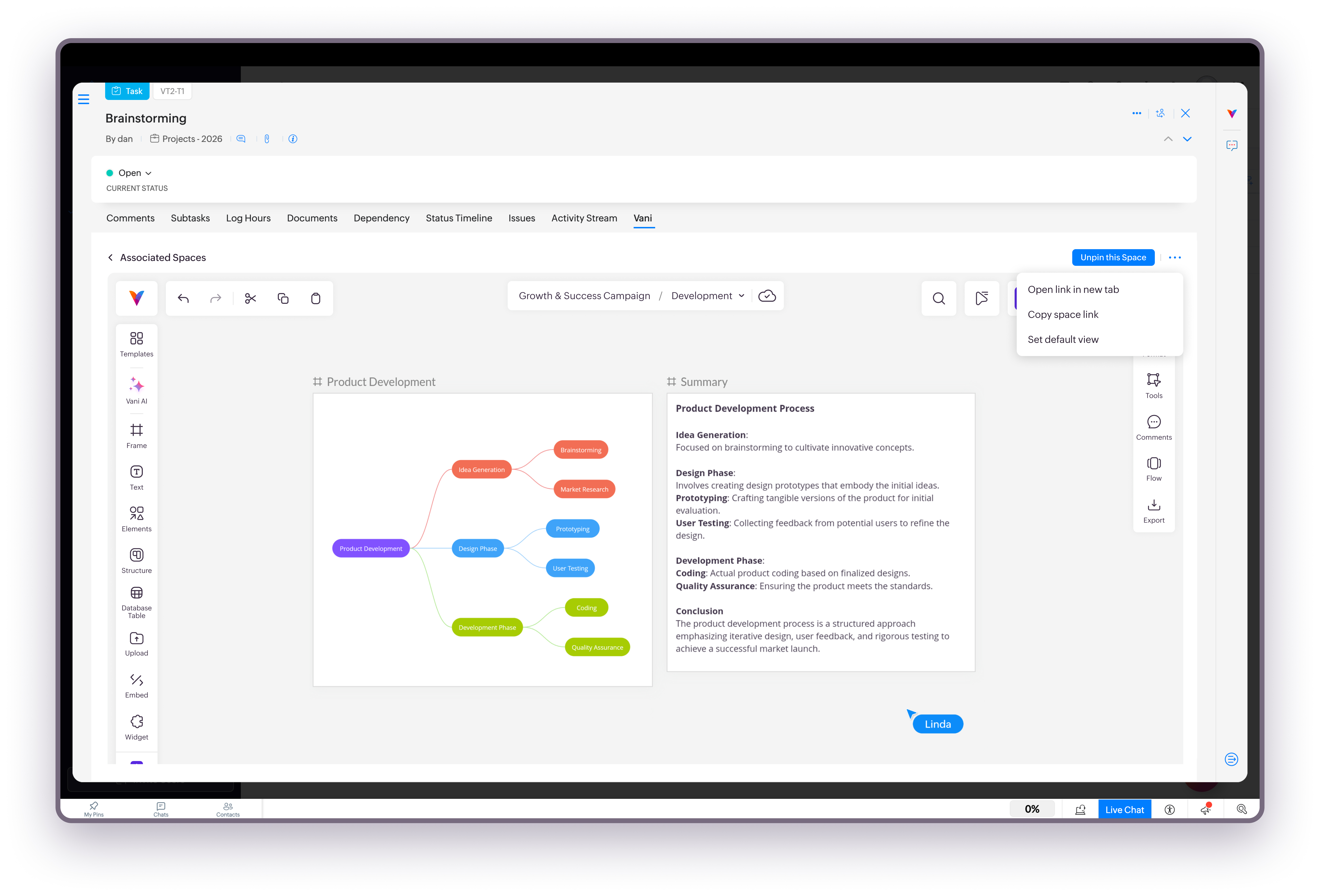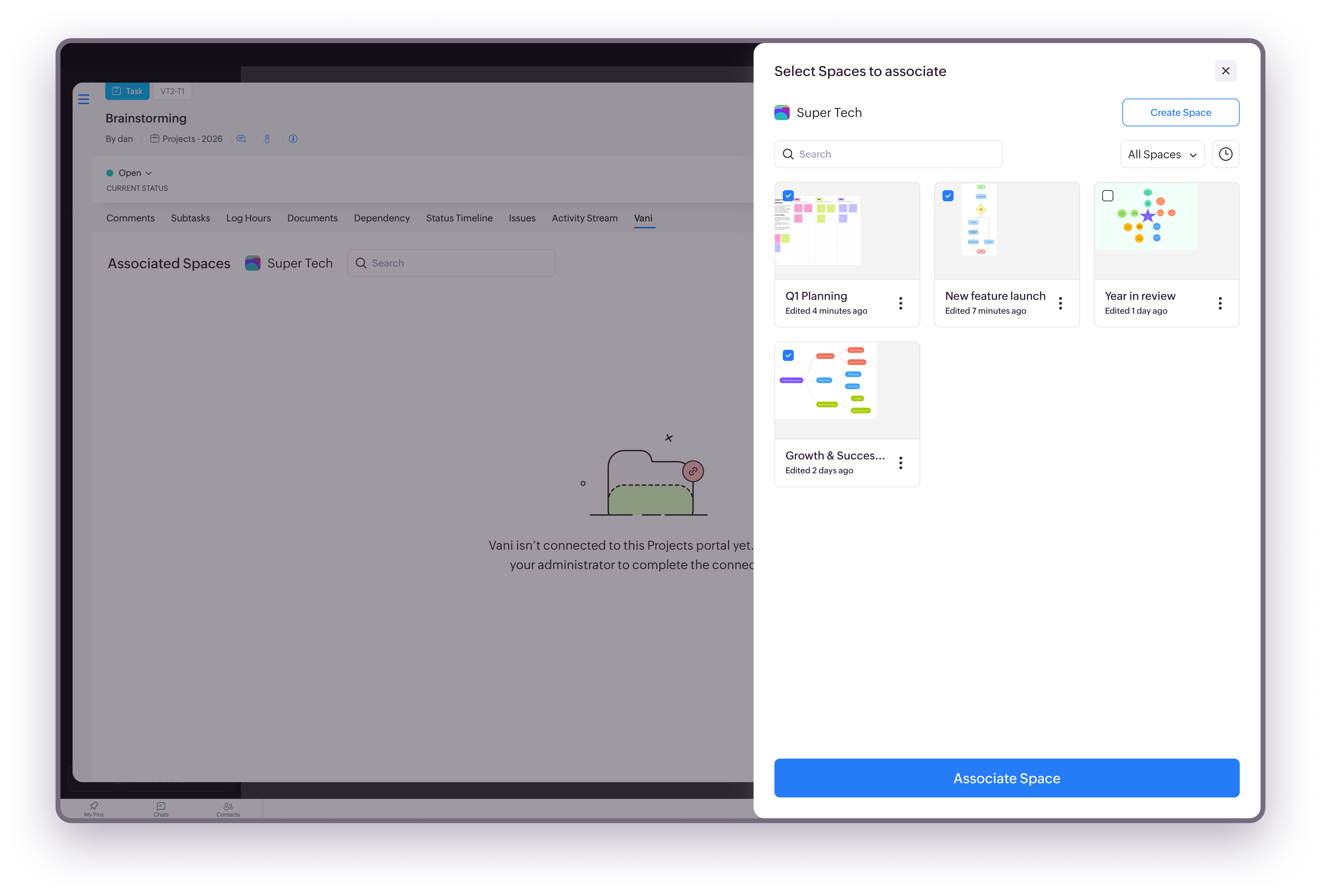 You can associate Vani Spaces with tasks to keep visual context connected to specific pieces of work within a project.